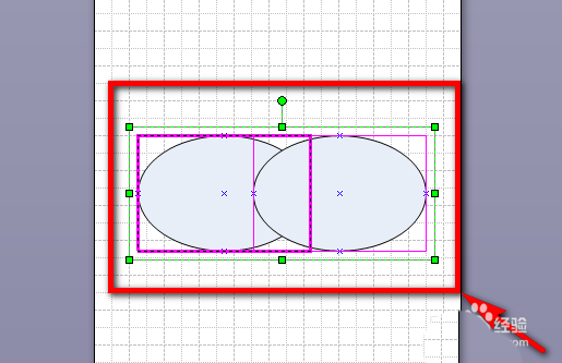 2、两个图形拖动到画布上后,将两个图形重叠交叉在一起,如图所示。