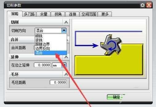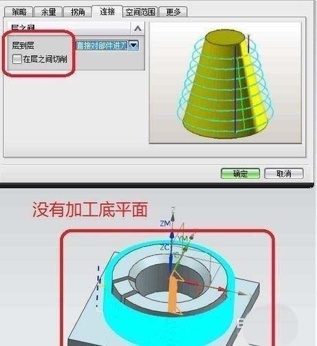 3、然后,用的是R刀 、深度加工轮廓是默认的精加工、第一刀就要切削到零件、所以第一刀深度就是刀具的R半径。