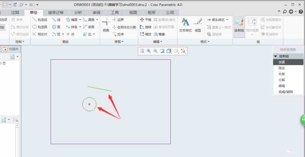 1、打开creo4.0软件,创建一个工程图文件。绘制一条直线和一个圆。如下图: