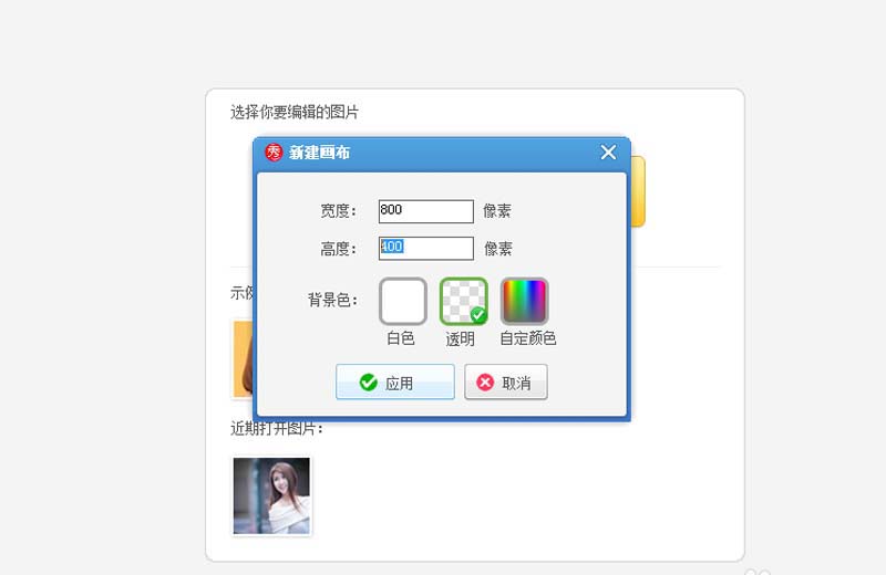 1、首先启动美图秀秀,点击右上角的新建命令,新建一个大小为800*400,背景为透明的文档。