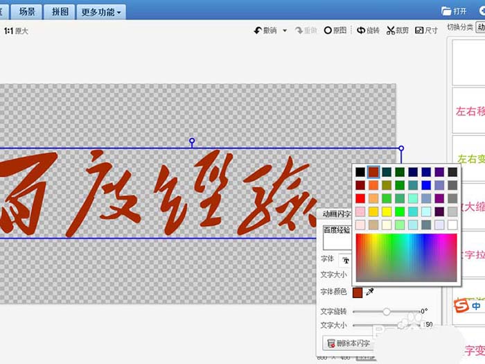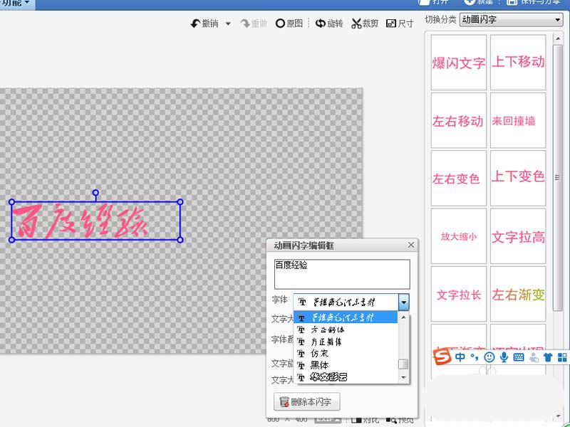 3、在动画闪字编辑框中输入文字,字体为草檀斋毛泽东字体。