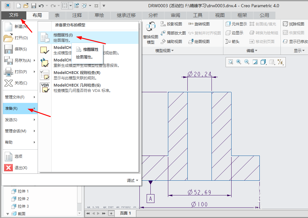 2、单击“文件”,在弹出的选项单击“准备”,再在弹出的选项单击“绘图属性”。