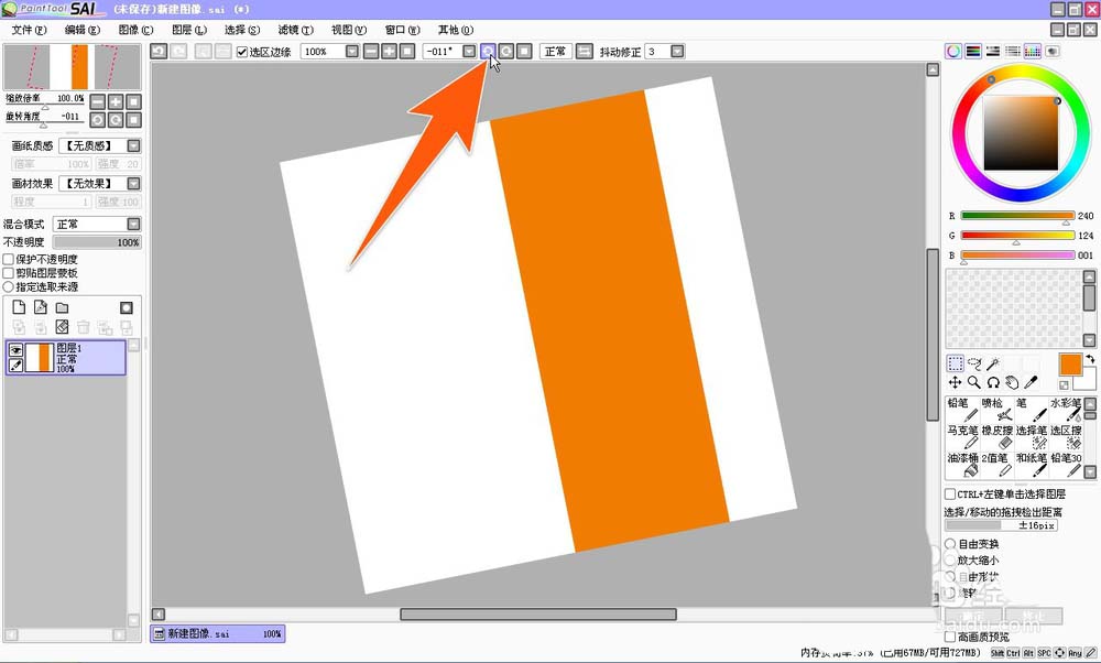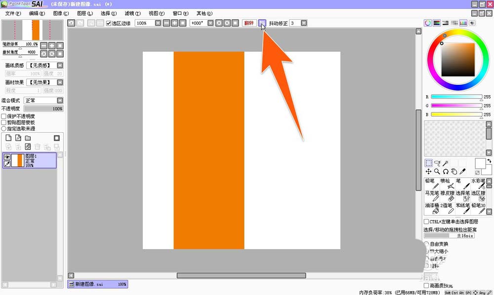3、当在SAI中需要水平翻转画布时,那么在上方工具栏里面,有一个带左右箭头状的图标,点击它就可以进行画布的水平翻转。