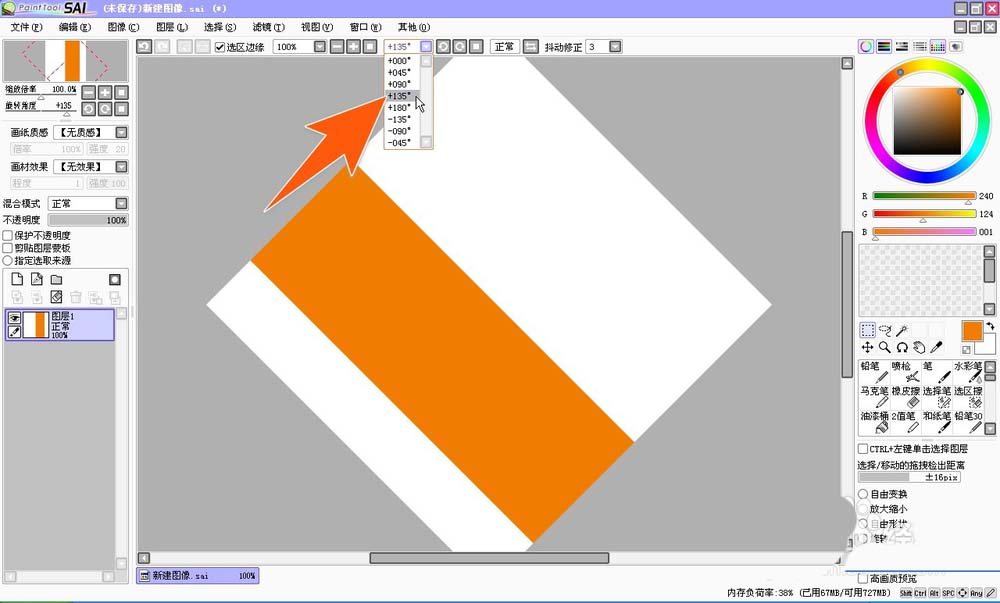 2、还可以直接在SAI中点击上方的那个旋转的角度,在弹出的下拉选项里面,有多种角度可以选择,需要哪个就点哪个角度。