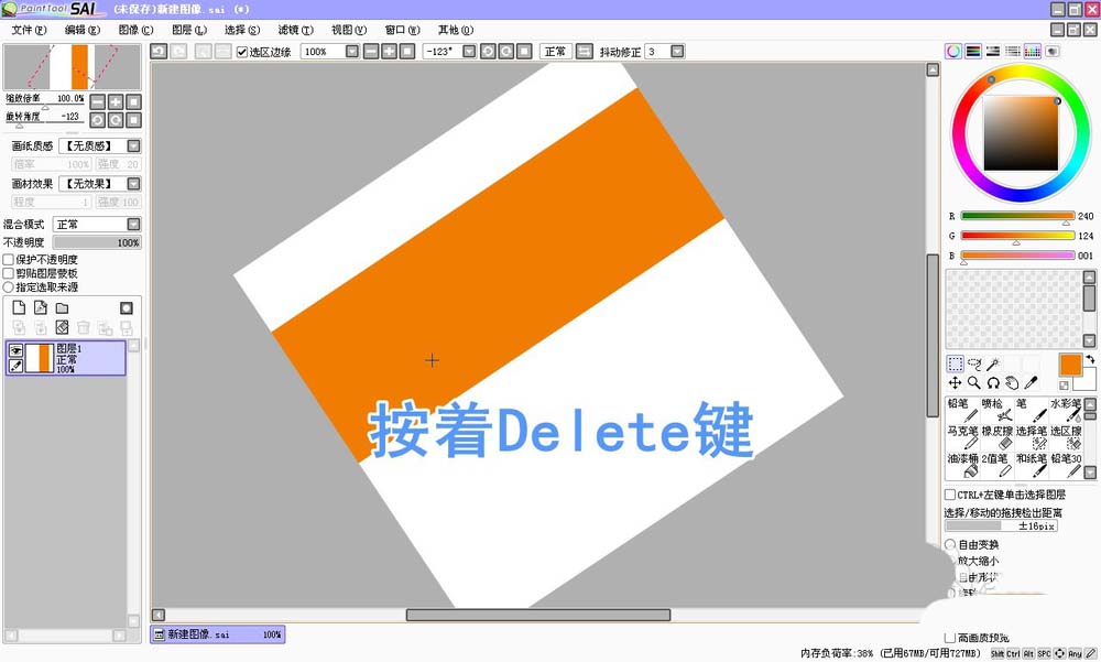 1、在sai中,可以按着Delete键不放,这时画布就会自动开始旋转,到了适合的角度时,只要松开Delete键就可以了。