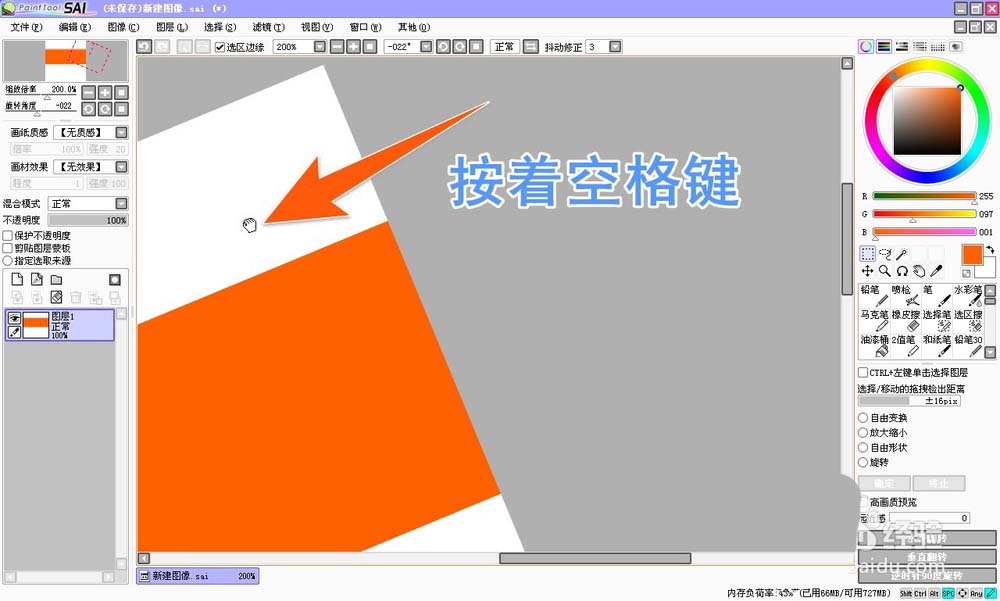 4、在SAI中,如果需要上下左右的移动画布时,只要按着空格键不放,再按着鼠标左键,然后就可以自由的在sai中移动拖动画布了。