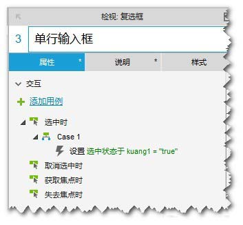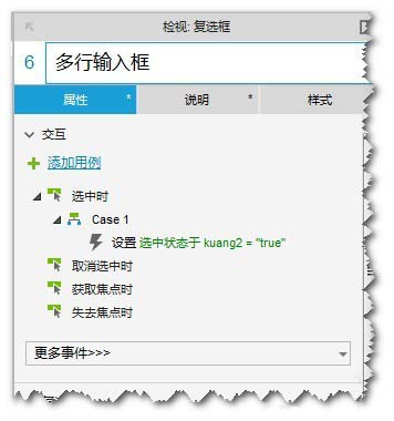 14、“复选框:多行输入框”的“鼠标单击时”,设置“动态面板:kuang2”为”选中“状态