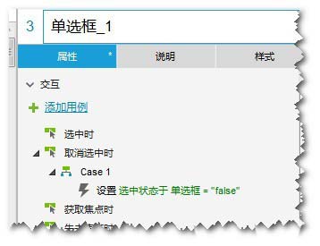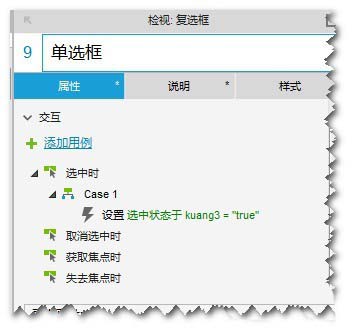 19、“复选框:单选框”的“鼠标单击时”,设置“动态面板:kuang3”为”选中“状态