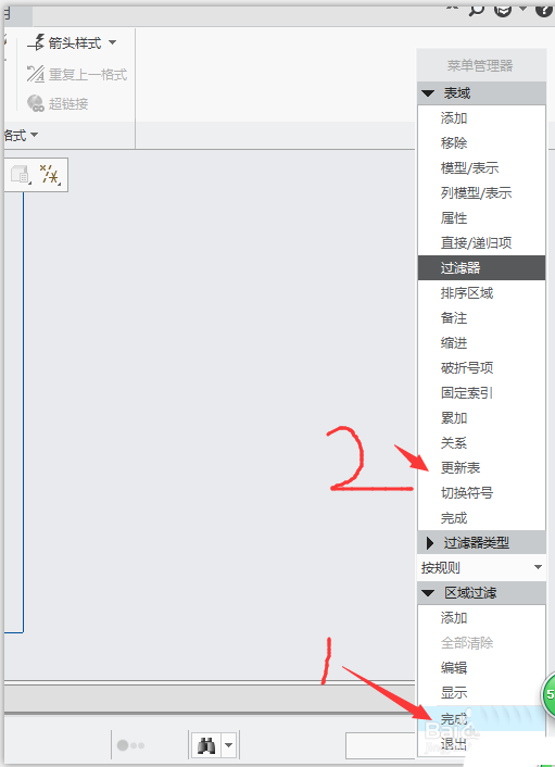 8、单击”菜单管理器“对话框中区域过滤项中的“完成”。然后单击”菜单管理器“对话框中“更新表”