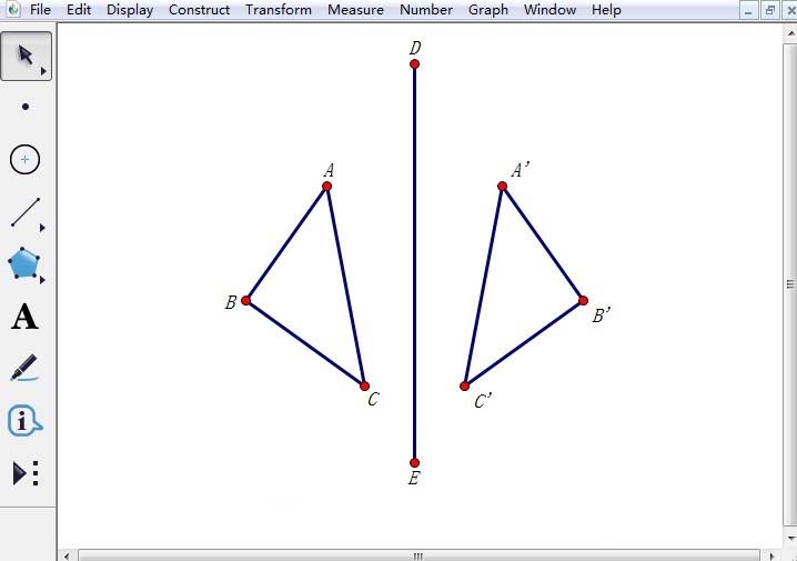 2、选中线段DE,执行“变换”——“标记镜面”命令;然后选中△ABC,执行“变换”——“反射”命令就得到了△A’B’C’。