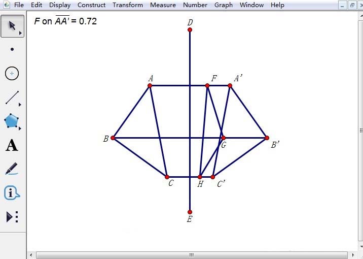 4、构造线段BB’,选中BB’,执行“绘图”——“在轴上绘制点”命令,然后用鼠标点击度量的点F在AA’上的值),这样就得到了点G,同理,在C’上得点H,依次连接点F、G、H,得到△FGH。