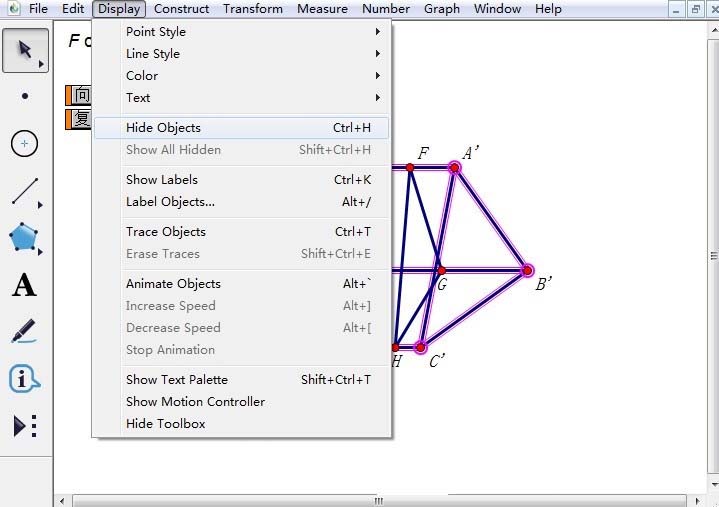 6、选中△A’B’C’和线段AA’、BB’、CC’,执行“显示”——“隐藏对象”命令,将不需要的对象进行隐藏。