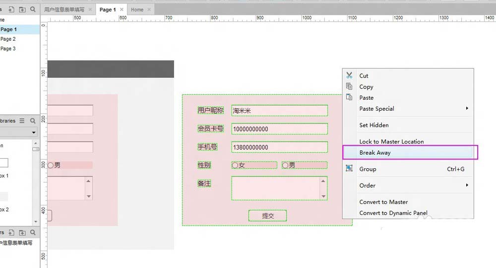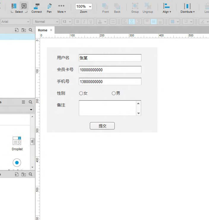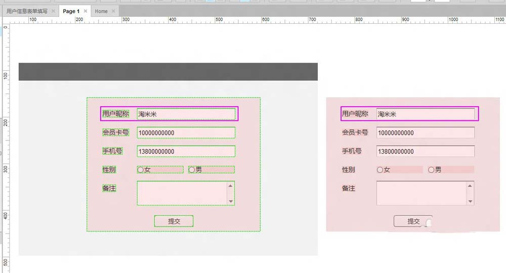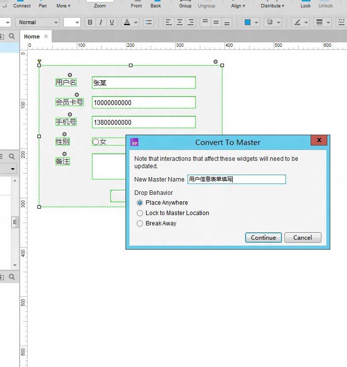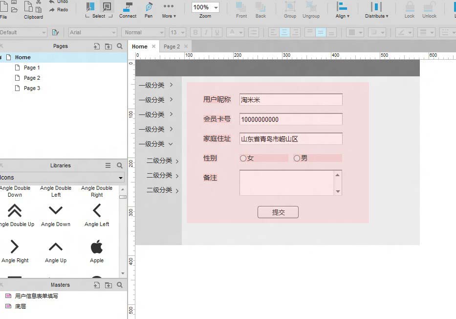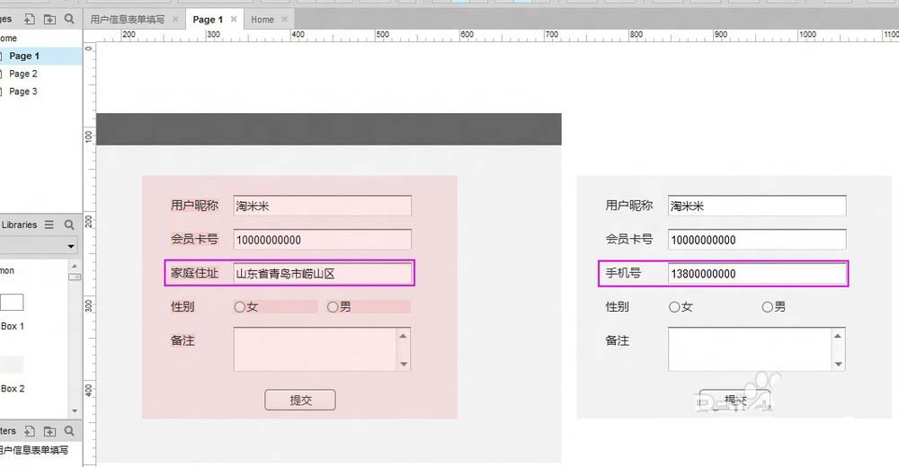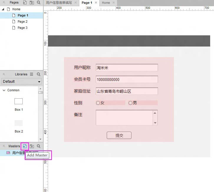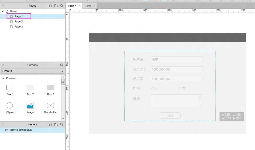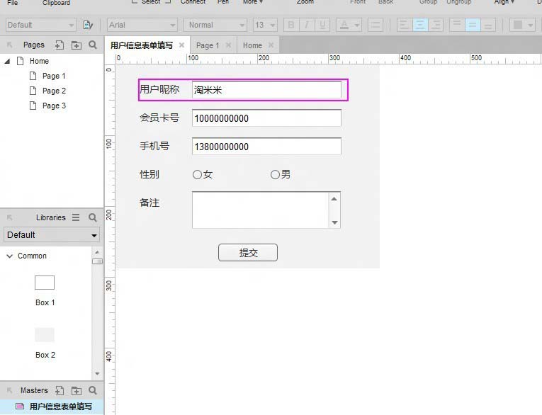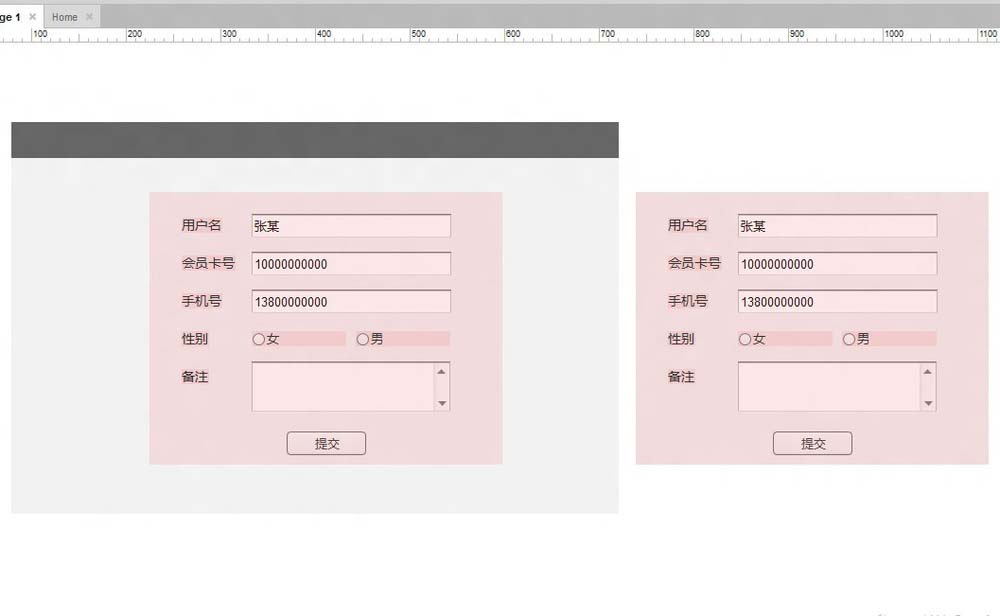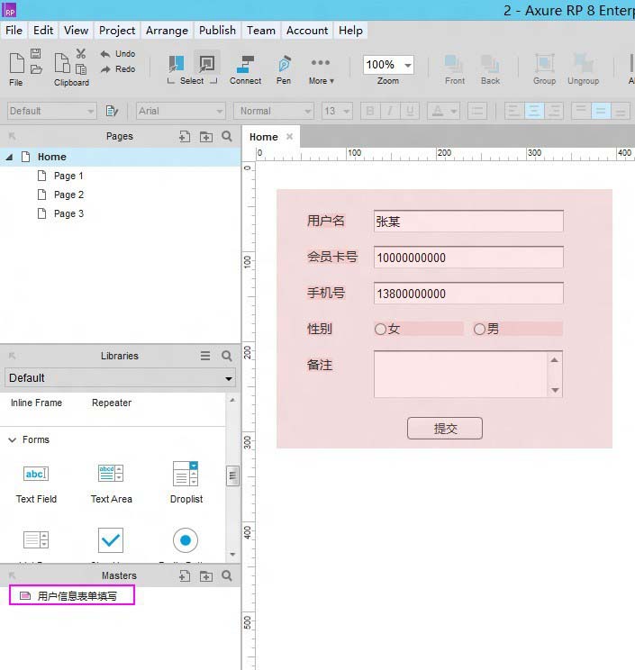 1、母版最佳使用场景是反复使用的组件,当然,还有一种情况是当使用Axure绘制流程图时,如果涉及的页面过多,可以按功能模块生成母版,方便编辑和查看,这个不属于这次的讨论范围,这里只说反复使用的母版,比如图中的表单,我在多个页面中都要使用到,那就非常适合使用母版的功能了