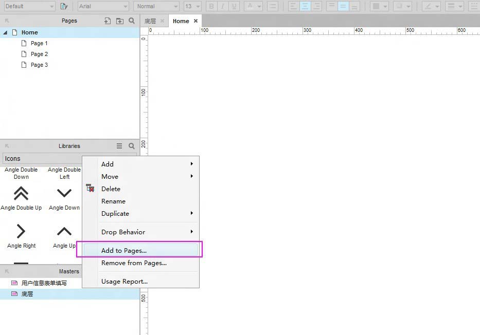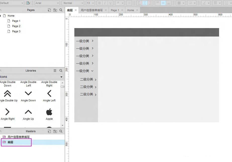 13、比如新建一个命名为“底层”的母版,在母版编辑页面添加元件