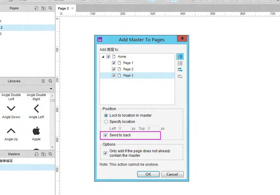 15、弹出面板中的选项比较多,最上面是选择需要添加到的页面,支持多选,中间是位置选项,其中一个是“置于底层”,作为整个案例,就可以勾选上,如果不勾选,会默认作为顶层加入到页面中。但需要注意的是,提示该“母版添加到页面功能”的操作不可撤销。