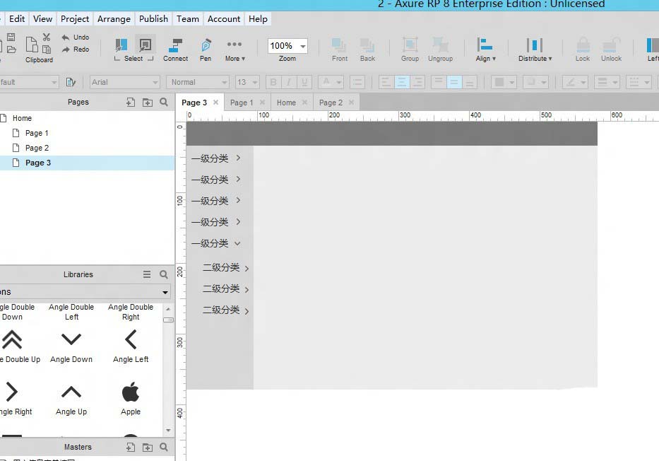 5、生成了母版之后可以在任意地方使用了(只要同属一个Axure源文件,可以是任何页面),使用方法很简单,只需要从左侧母版列表中拖进去就可以了。