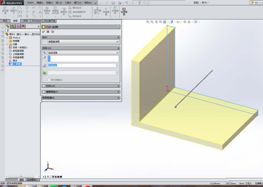 2、用“拉伸凸台/基体”命令拉伸一个90度的实体,如下图所示。