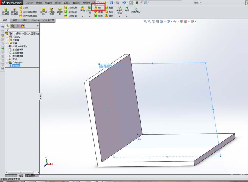 1、打开SolidWorks软件,新建一个零件文件,并用“拉伸凸台/基体”命令造一个90°的实体,作为演示所用,实体形状如下第二幅图所示。