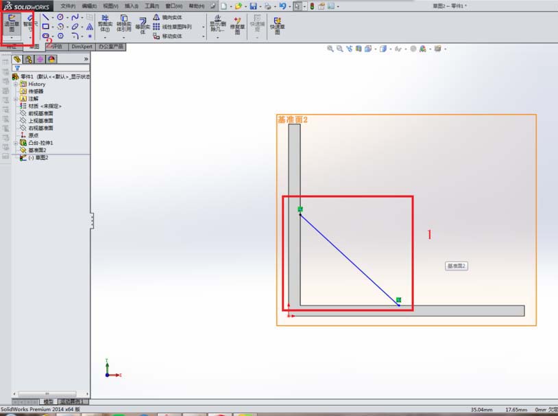 7、然后以基准面2为草图平面,画一条直线,如下图所示,然后点击退出草图。