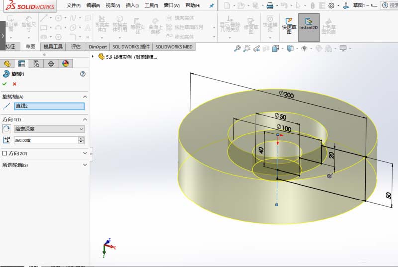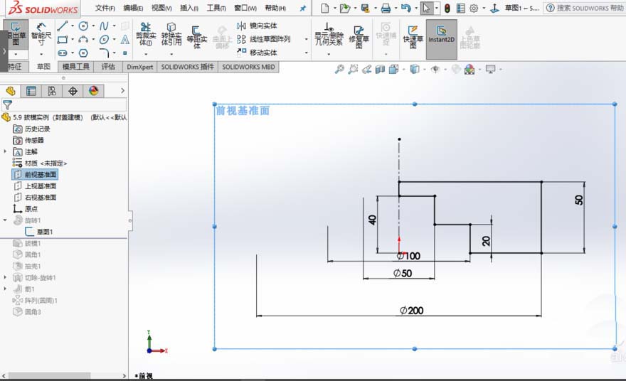 2、选定前视基准面,正视所选基准面,利用直线命令进行绘草图,并设定相关尺寸。采用旋转凸台特征命令,点击确定。