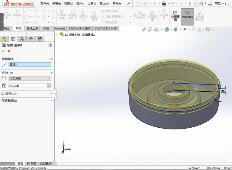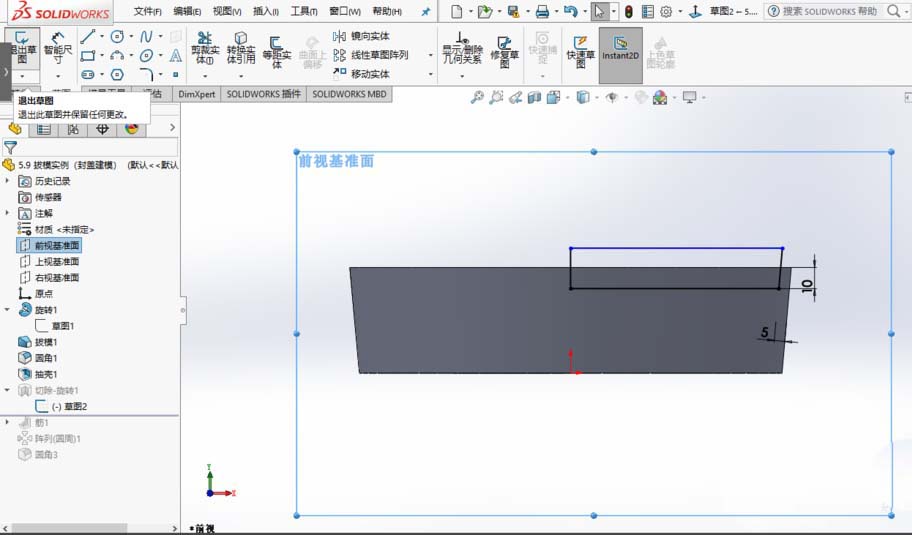 6、选定前视基准面,正视所选基准面,利用直线命令进行绘草图,并设定相关尺寸。采用旋转切除特征命令,点击确定。