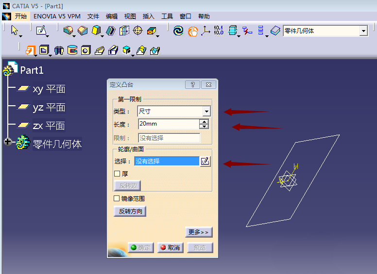 4、点击凸台命令,弹出定义凸台对话框。类型下拉菜单里面常用到尺寸、直到下一个,长度即凸台的厚度,轮廓曲线即我们刚完成的草图