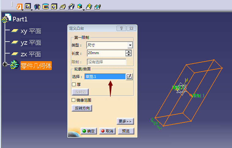 5、点击轮廓曲线下方的选择对话框后选择我们绘制好的草图,呈现出凸台的预览状态,点击确定,长方形凸台绘制完成