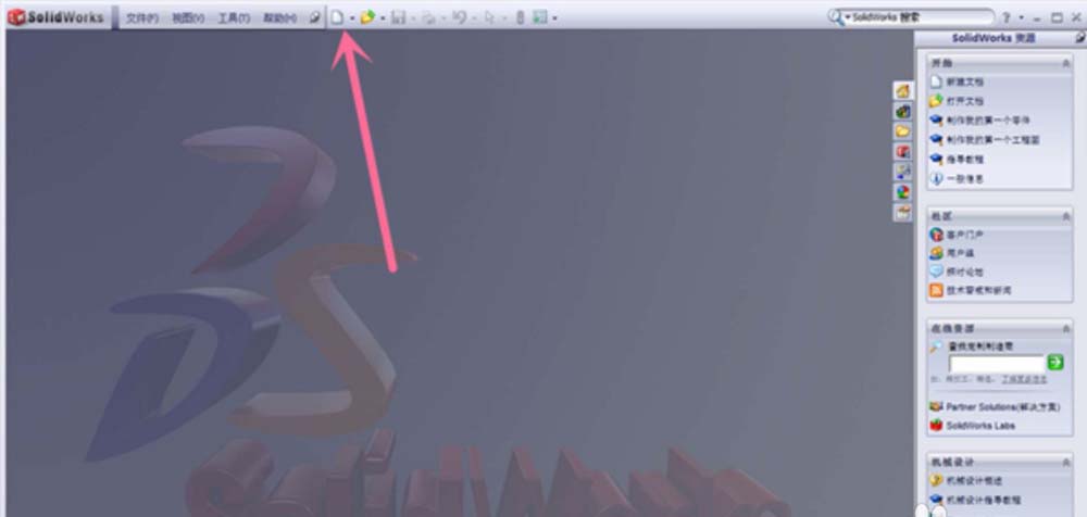 1、点击打开SolidWorks 2010软件,此时会弹出SolidWorks 2010软件的首页,在SolidWorks 2010软件的首页我们点击软件上方主菜单栏里的新建图标。