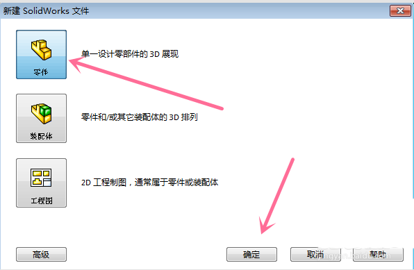 2、此时在SolidWorks 2010首页会弹出SolidWorks 2010软件新建文件选择菜单页面,在选择菜单页面里我们点击选择里面的第一选项零件选项,然后点击下方的确定按钮。