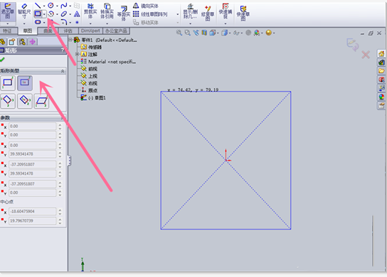 5、基准面选择完以后我们就可以点击上方菜单栏里的草图绘制工具进行草图绘制了,这里我们点击四边形图标,此时在软件的右侧会弹出绘制提示,我们按照提示在绘图区进行绘制就行了