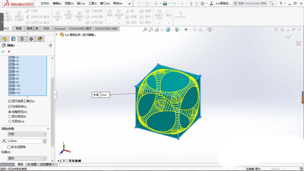 3、采用圆角特征命令,选择所有边线,点击确定。