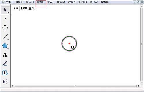 2、构造圆心和圆。利用点工具构造一个点O。选定点O和参数a,选择菜单“构造”——“以半径和圆心绘圆”。