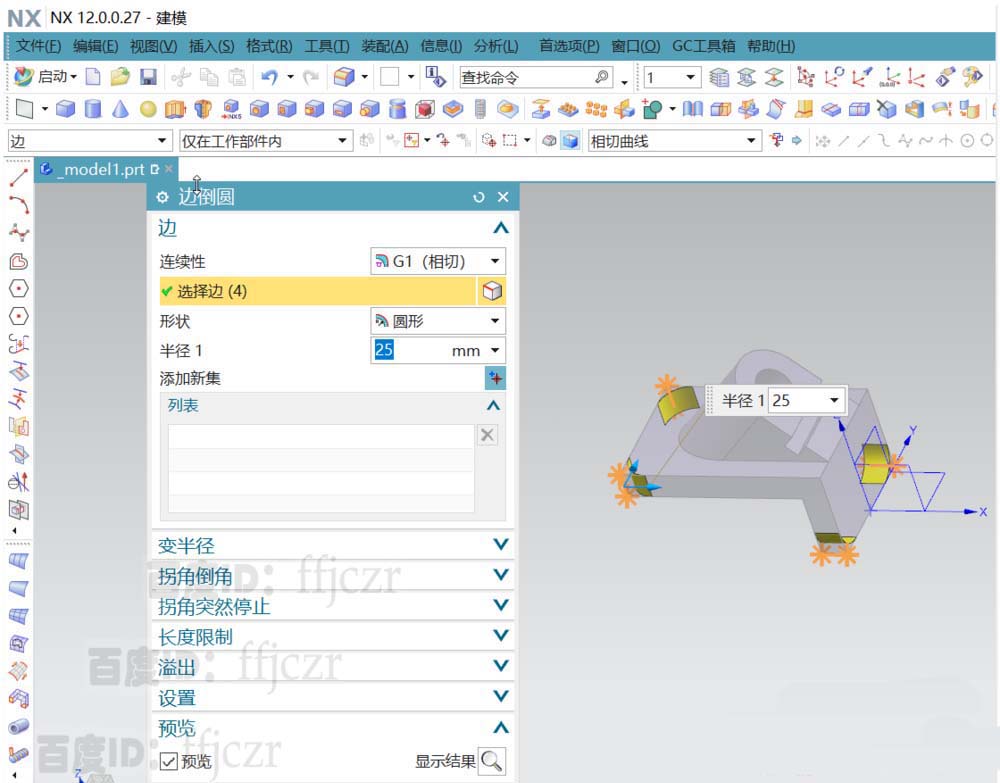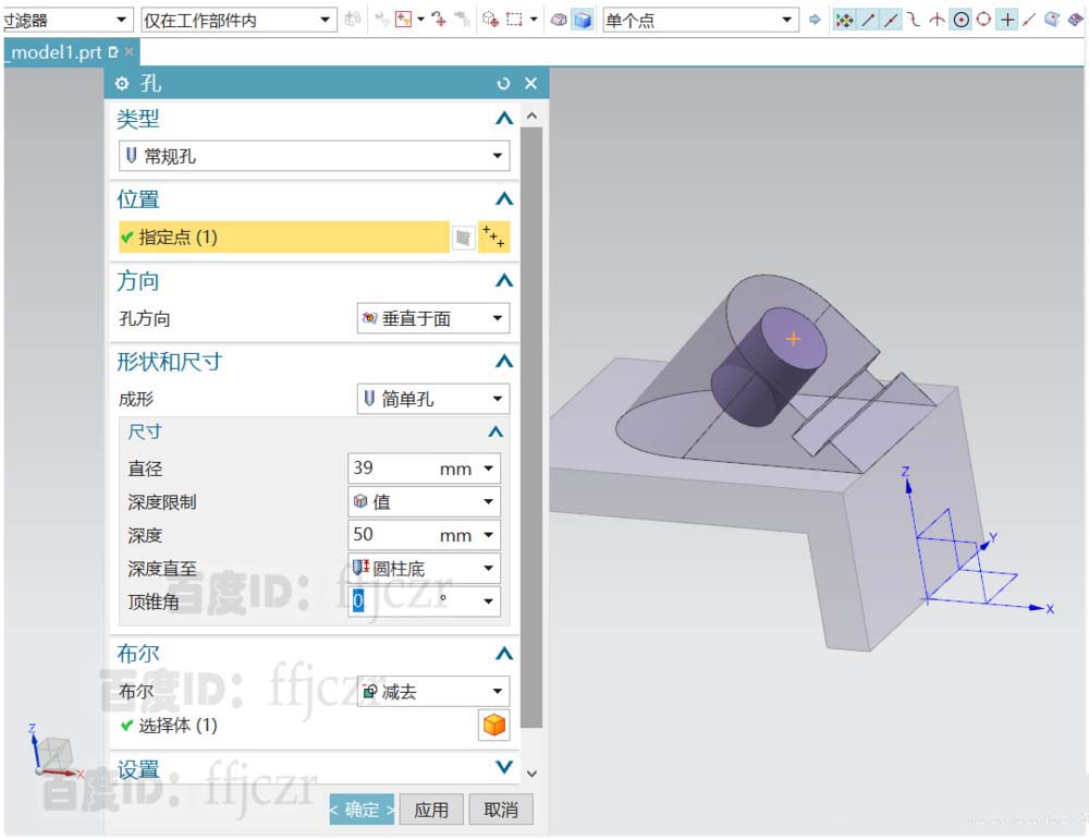 6、用孔命令,以上步倒圆所形成的圆心为开孔的定点,开出一个直径为39深50的平头孔。给整体模型的四个角进行倒R25的圆角,为下一步做好参考。