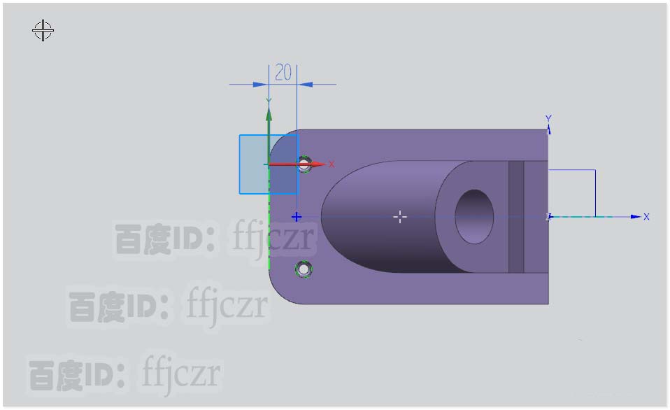 7、根据四角倒圆形成的圆心,分别在L形长面上开M12的螺丝孔;在短面上开直径为24的通孔。
