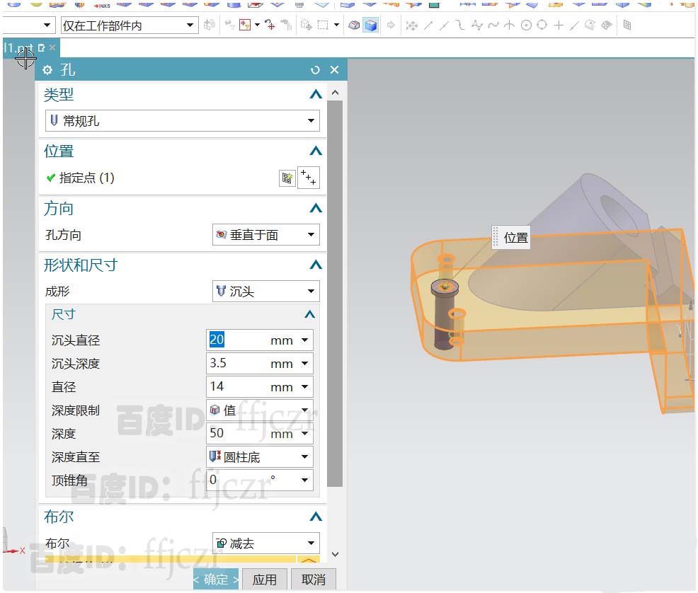 8、选用开孔命令,进入草图模式对开孔的点进行定位,数值如图所示;完成点的定位后,回到孔对话框,修改参数:成形类型为沉产学研,大直径为:20,深度3.5,孔直径为14.确定后得到相应的沉头孔。