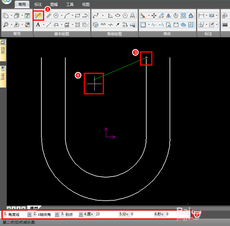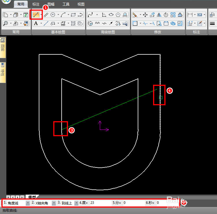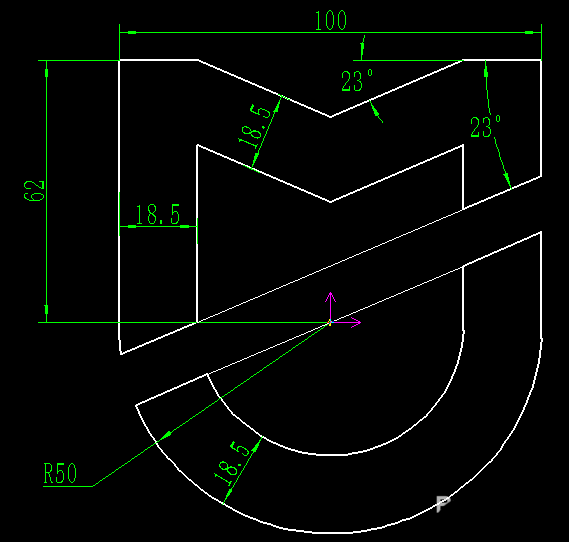 6、以等距后图形的右上角为起点绘制与X轴夹角23°的直线;
