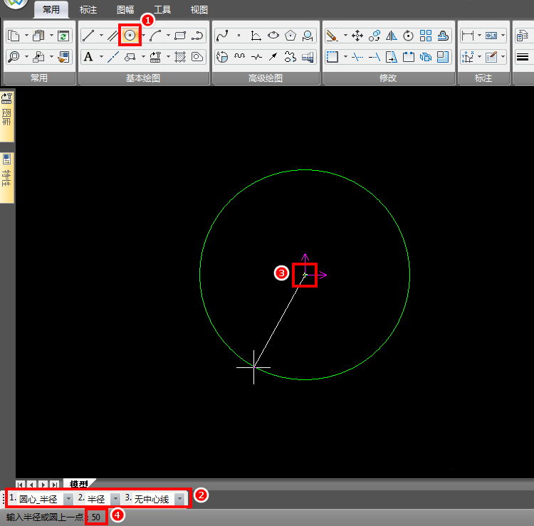 2、先绘制主要外形,使用圆命令,以坐标原点为圆心绘制直径为100的圆;