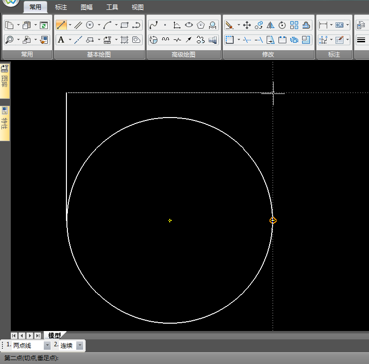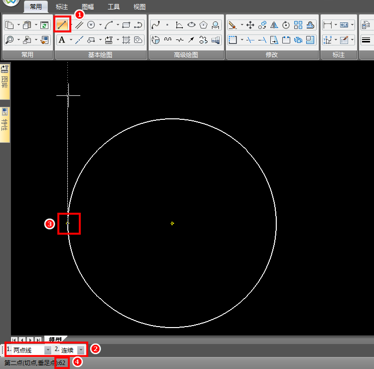 3、再以圆的最左边为起点,向上绘制长62的竖直直线,接着如图对齐绘制长100的水平线段,再向下绘制竖直直线与圆相切;