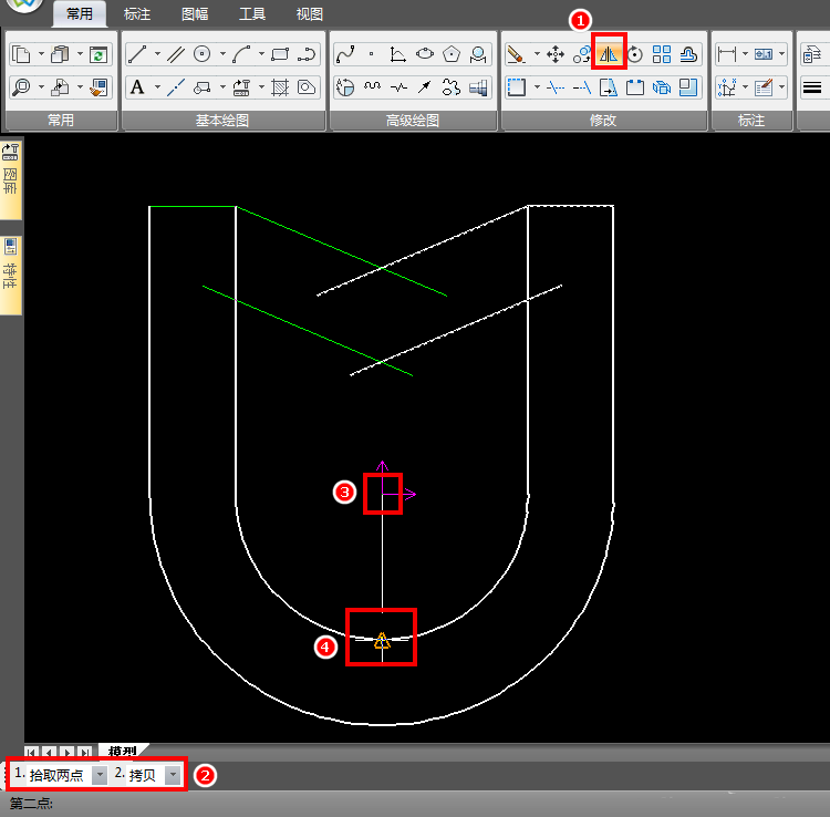 9、使用镜像命令,将刚刚绘制的两条角度线和水平线段做镜像操作;