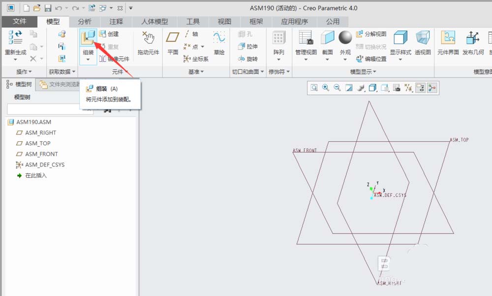 2、单击“模型”功能选项卡“件区”域中的“组装”。弹出“打开”对话框。