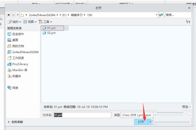 3、在“打开”对话框中找到选中要组装的零件名称(比如下图中的"01.prt"),单击“打开”。