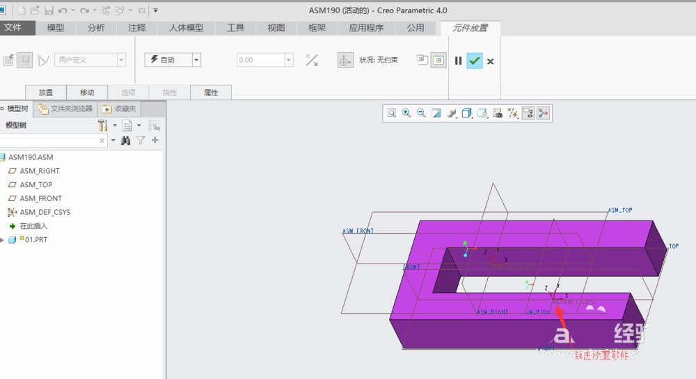 10、通过以上4组约束后,零件”01.PRT“完成被约束,单击“元件放置”操作板中的“确定”按钮,完成零件装配。