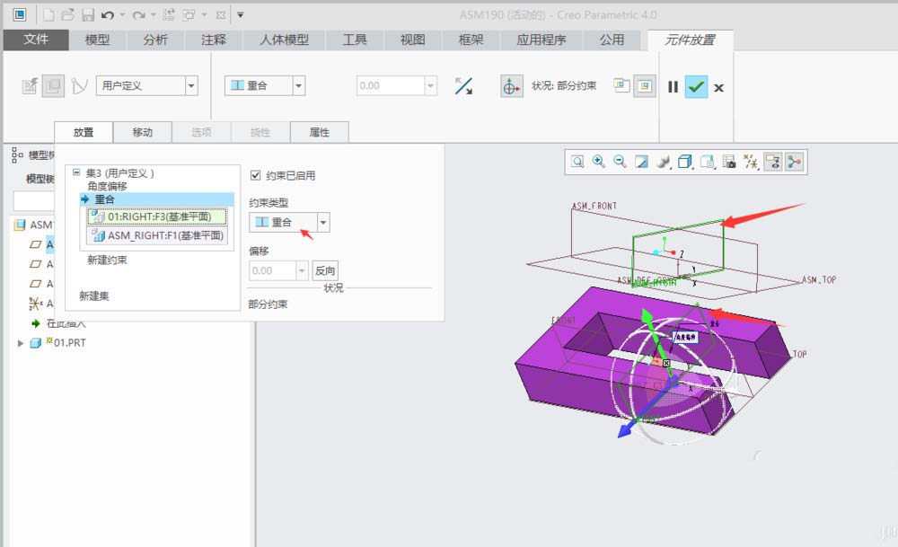 7、由于只有一个角度偏移约束零件不能被完成约束,下面添加其它约束。新建一个约束,约束类型设为“重合”,单击”ASM_RIGHT“和”RIGHT“两个基准面。