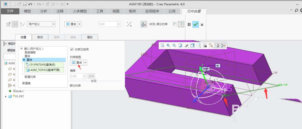 8、新建一个约束,约束类型设为“重合”,单击”ASM_TOP“基准面和”PNT0“基准点。