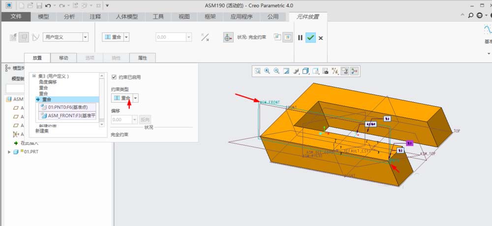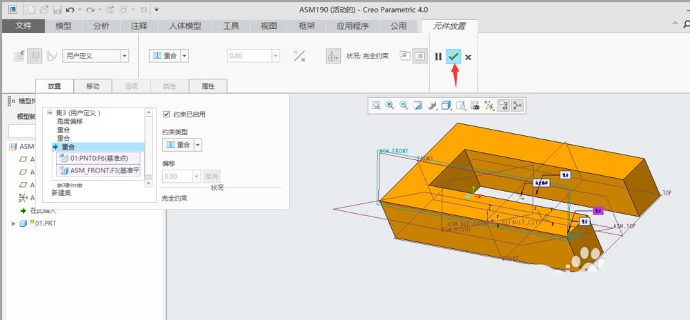 9、新建一个约束,约束类型设为“重合”,单击”ASM_FRONT“基准面和”PNT0“基准点。