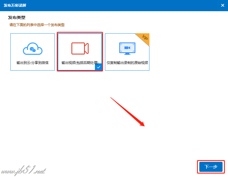点击“发布”按钮-->选择其中一种发布类型,如“输出成视频”-->然后进入下一步。