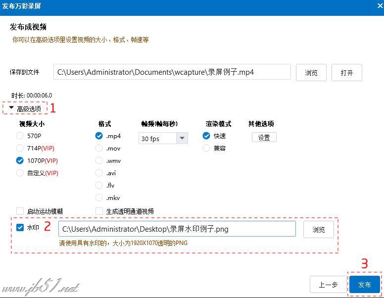 打开“高级选项”-->勾选“水印”-->点击“浏览”添加PNG图片-->最后点击“发布”。