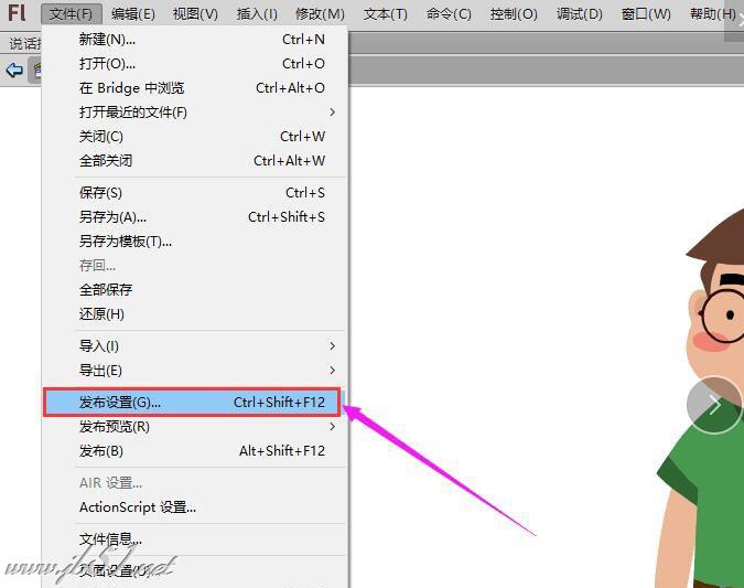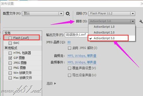 优先输出SWF格式的角色表情,发布设置的时候,脚本建议选ActionScript 3.0,输出的SWF效果较好(如下图)。