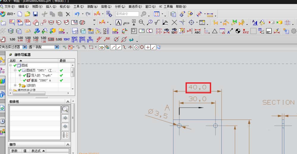 1、用UG打开一个图纸,已经转成二维图。上面小数点为一个逗号,我们要将它更改