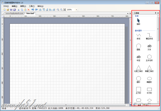 2、在软件右侧的“工具箱”中,选择所需的素材,绘制流程图。